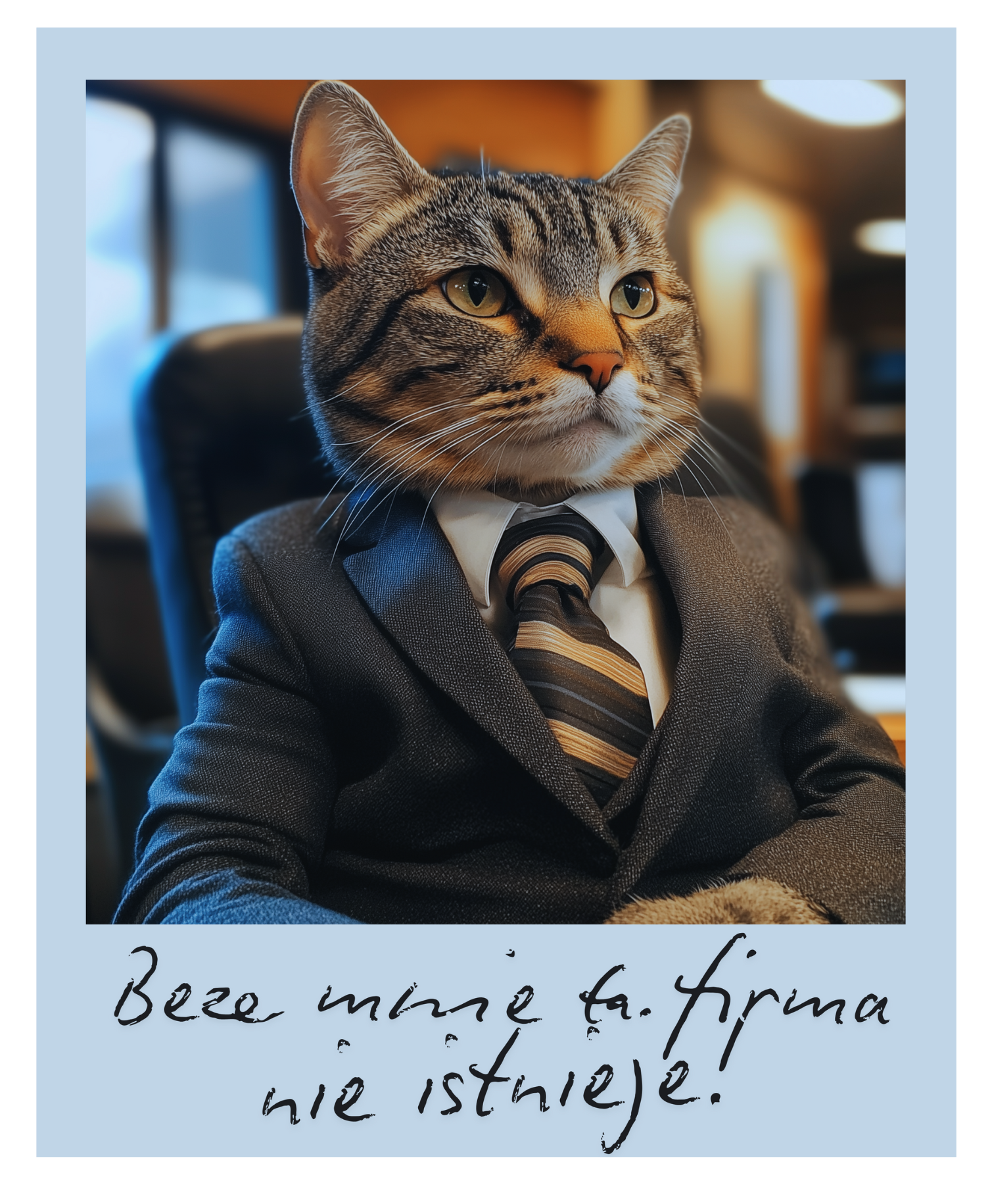 Na pierwszy rzut oka – typowy szef. Marynarka idealnie dopasowana, krawat wiązany z precyzją godną mistrza ceremonii, spojrzenie pełne powagi. Ale poczekaj, to przecież... kot! Tak, to kot, który nie tylko zna wszystkie strategie biznesowe, ale i sekrety, których nie zdradziłby nawet na najważniejszym zebraniu.