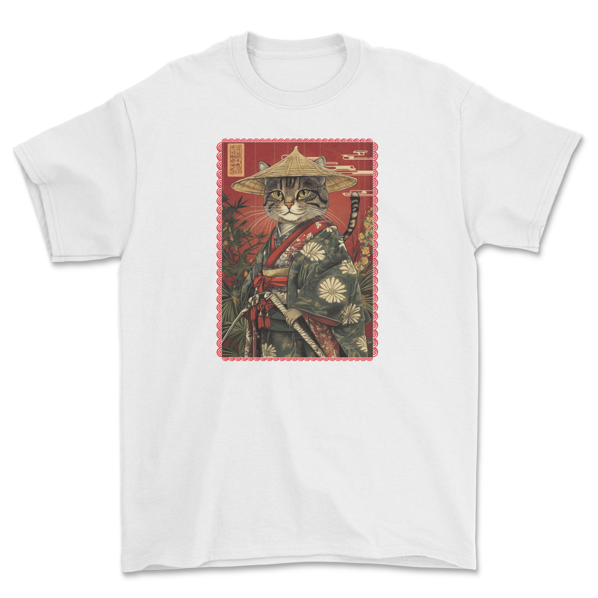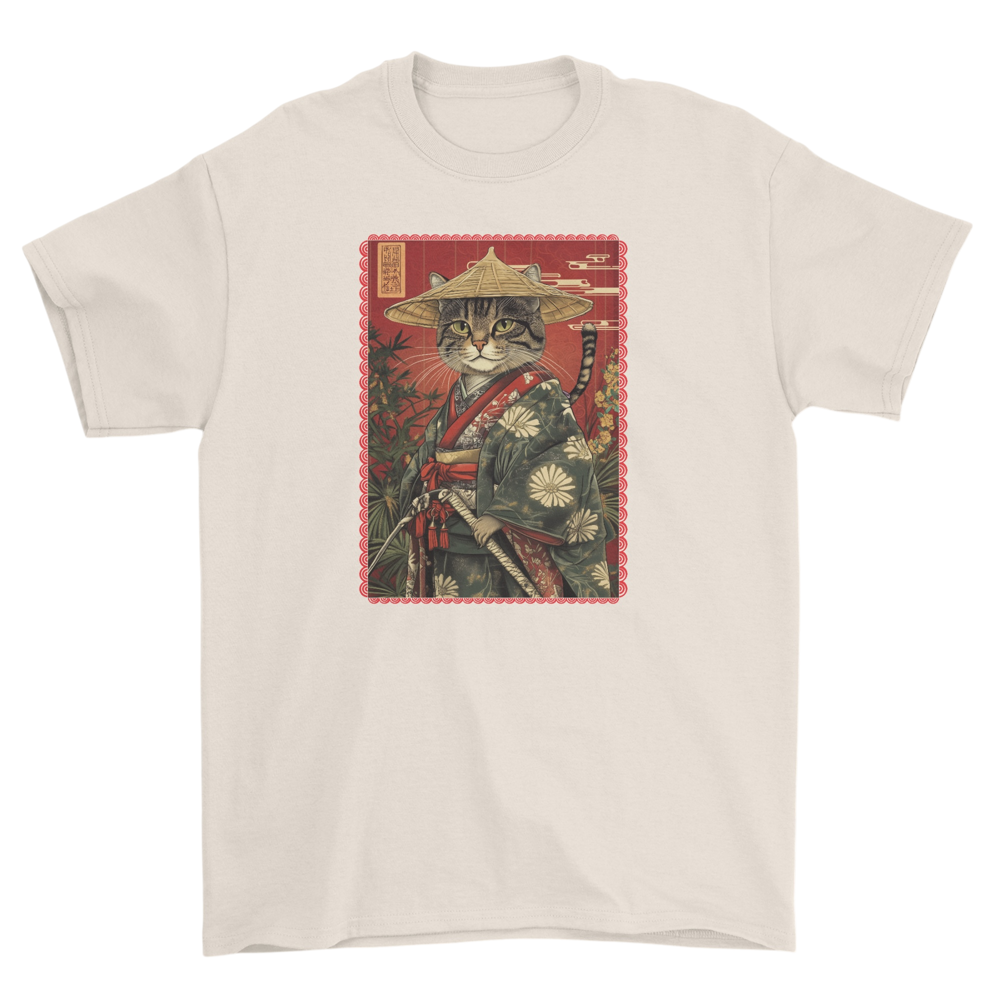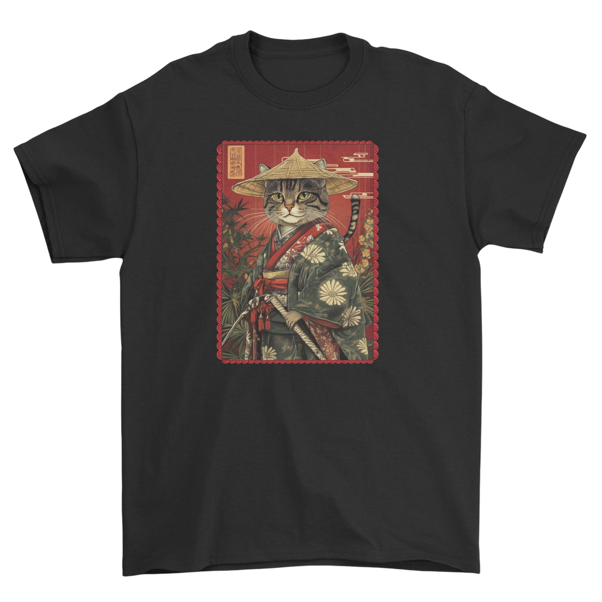 Koszulka z kotem wojownikiem w bambusowym lesie - japoński kot bushido neko