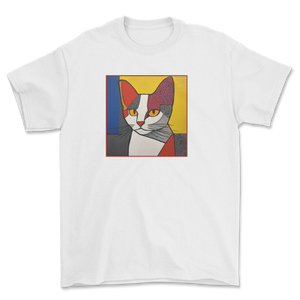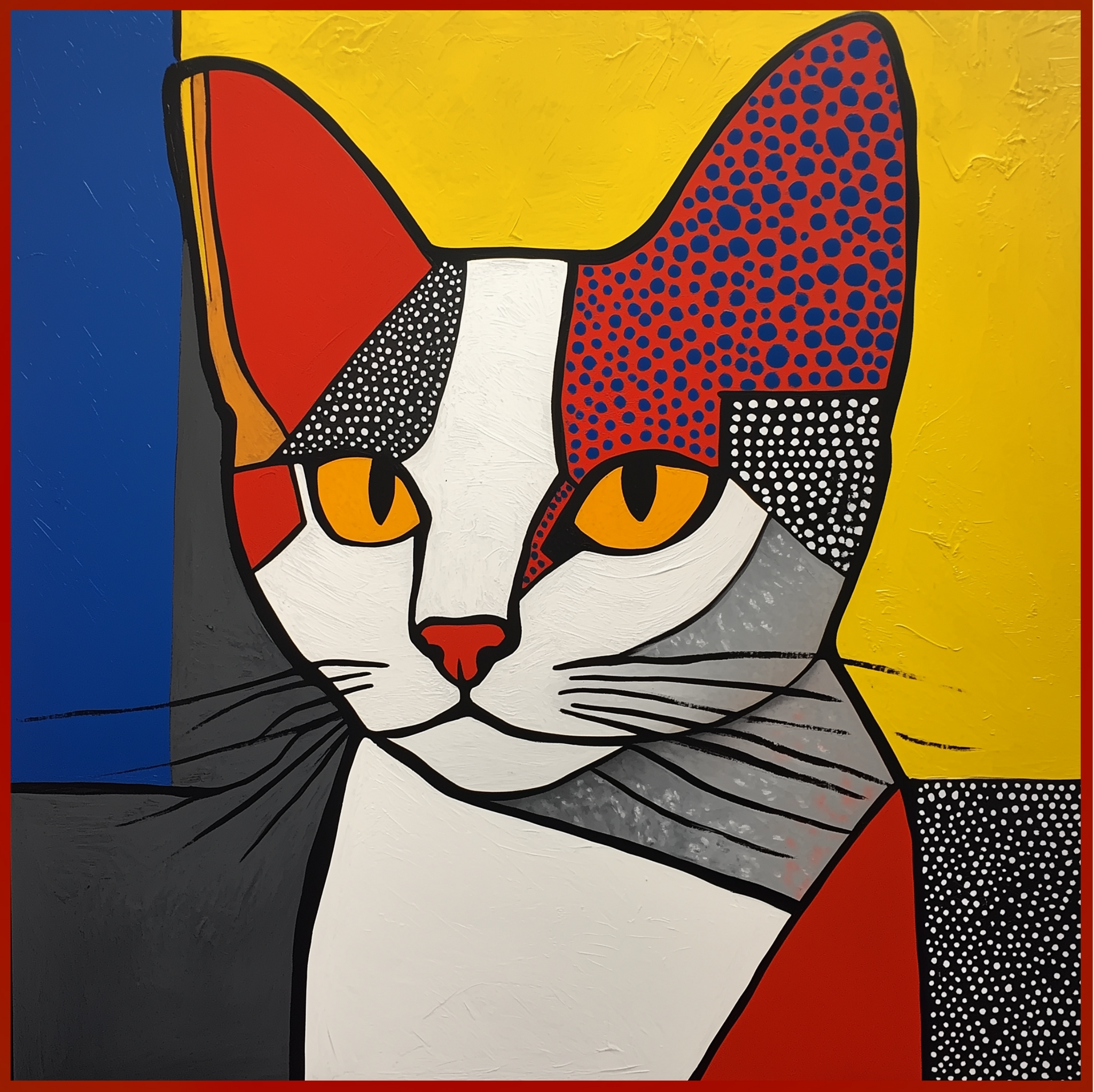 Ten kot wydaje się jakby wyskoczył z komiksowego świata, pełnego żywych barw i geometrycznych linii. Jego spojrzenie to klasyczna mieszanka kociej nonszalancji i ciekawości, a plamy i kropki na futrze sugerują ukrytą opowieść.
