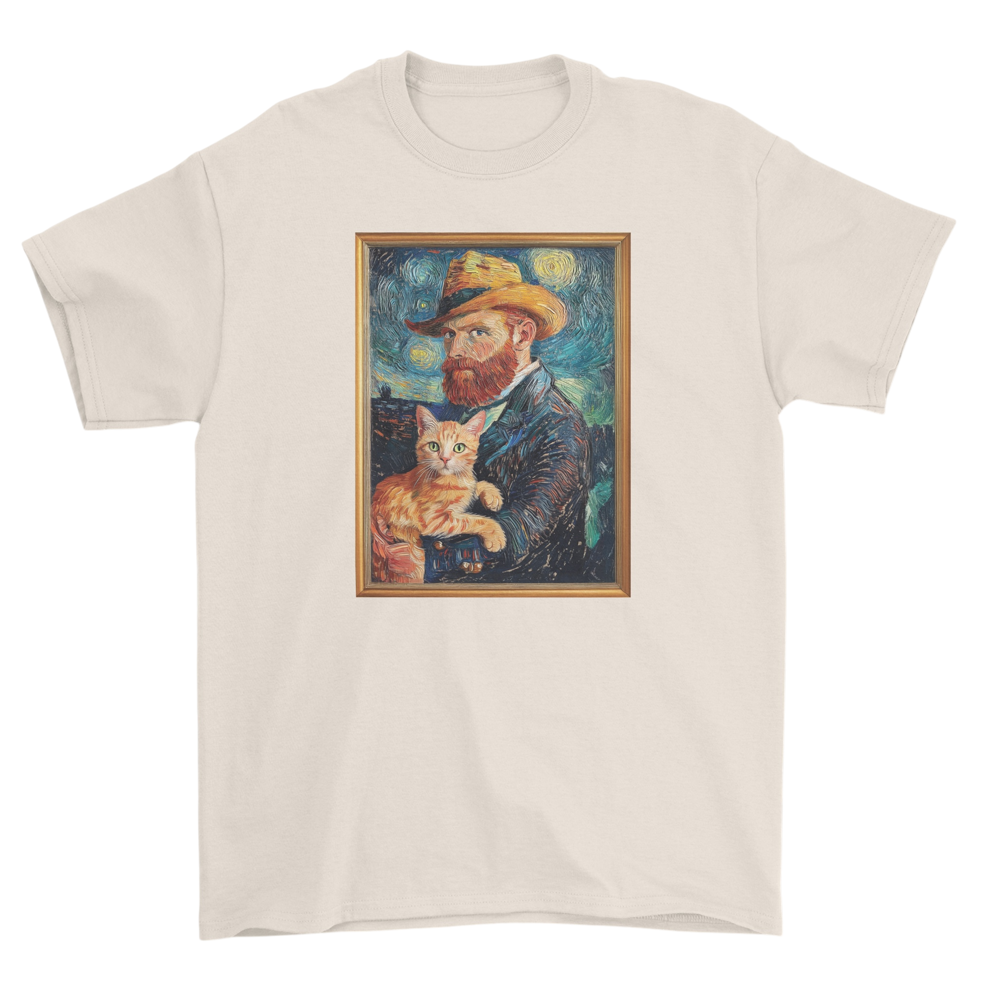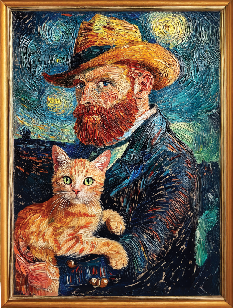 W wirującym świecie kolorów i pociągnięć pędzla, gdzie każda linia zdaje się oddychać emocjami, pojawia się on – rudy kot, który wydaje się być nieodłącznym towarzyszem artysty. Jego bursztynowe oczy wpatrują się w widza z tajemnicą, jakby i on, tak jak Van Gogh, dostrzegał więcej niż to, co powierzchowne.