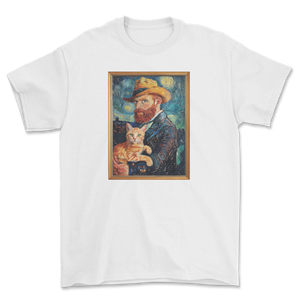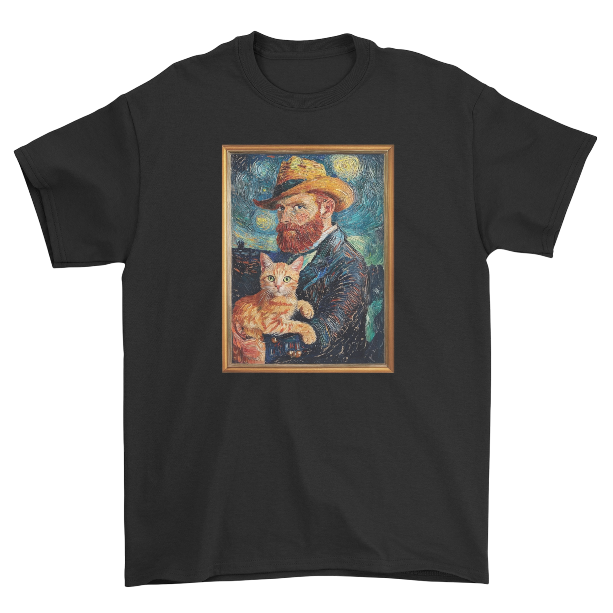Postać artysty, z charakterystycznym kapeluszem i hipnotyzującym spojrzeniem, zdaje się odnajdywać ukojenie w obecności swojego kociego kompana. Kot, z wdziękiem wtulony w ramiona, jest jak ożywiony fragment „Gwiaździstej nocy” – ciepły, pełen życia i harmonii w otaczającym chaosie.