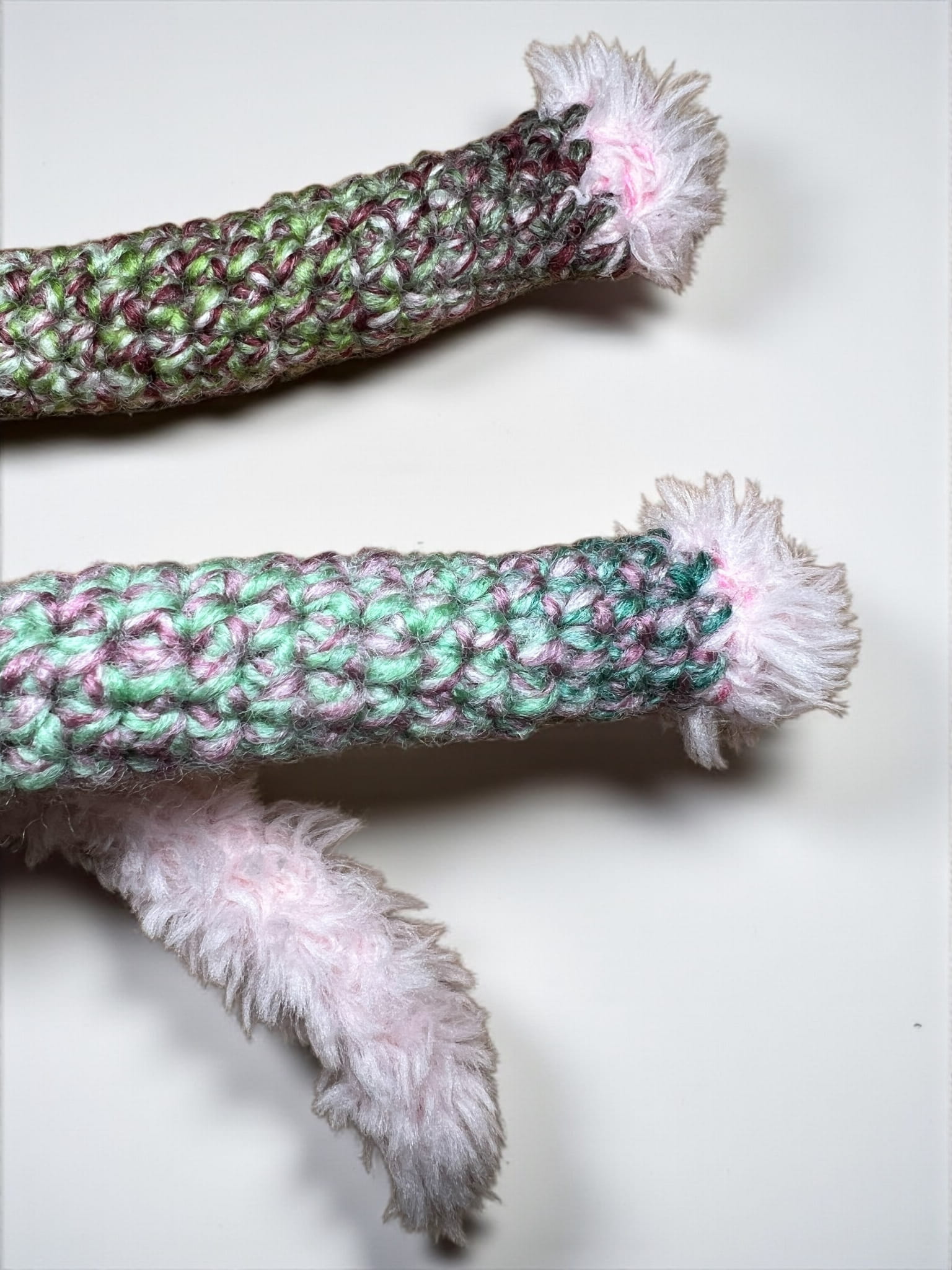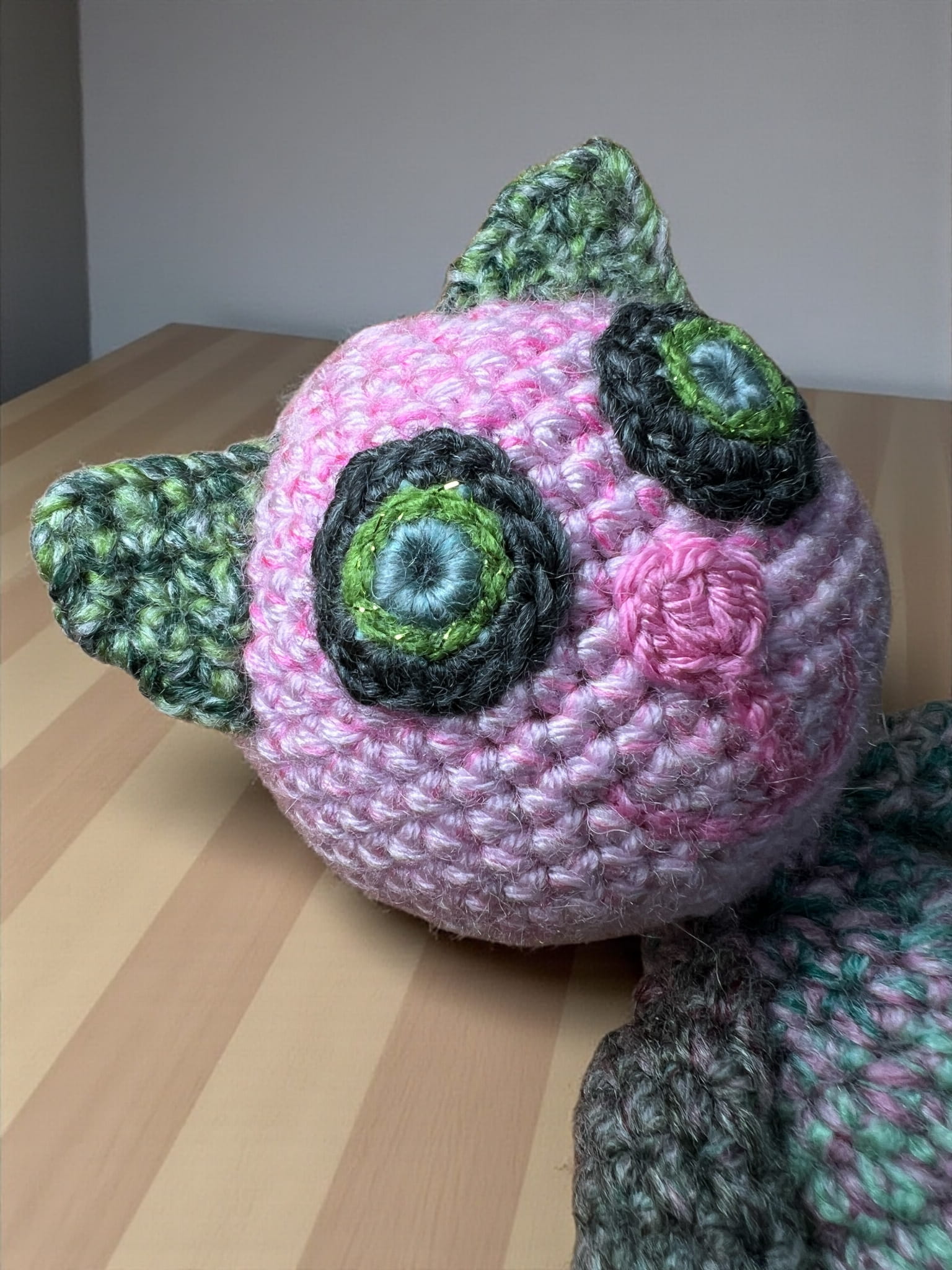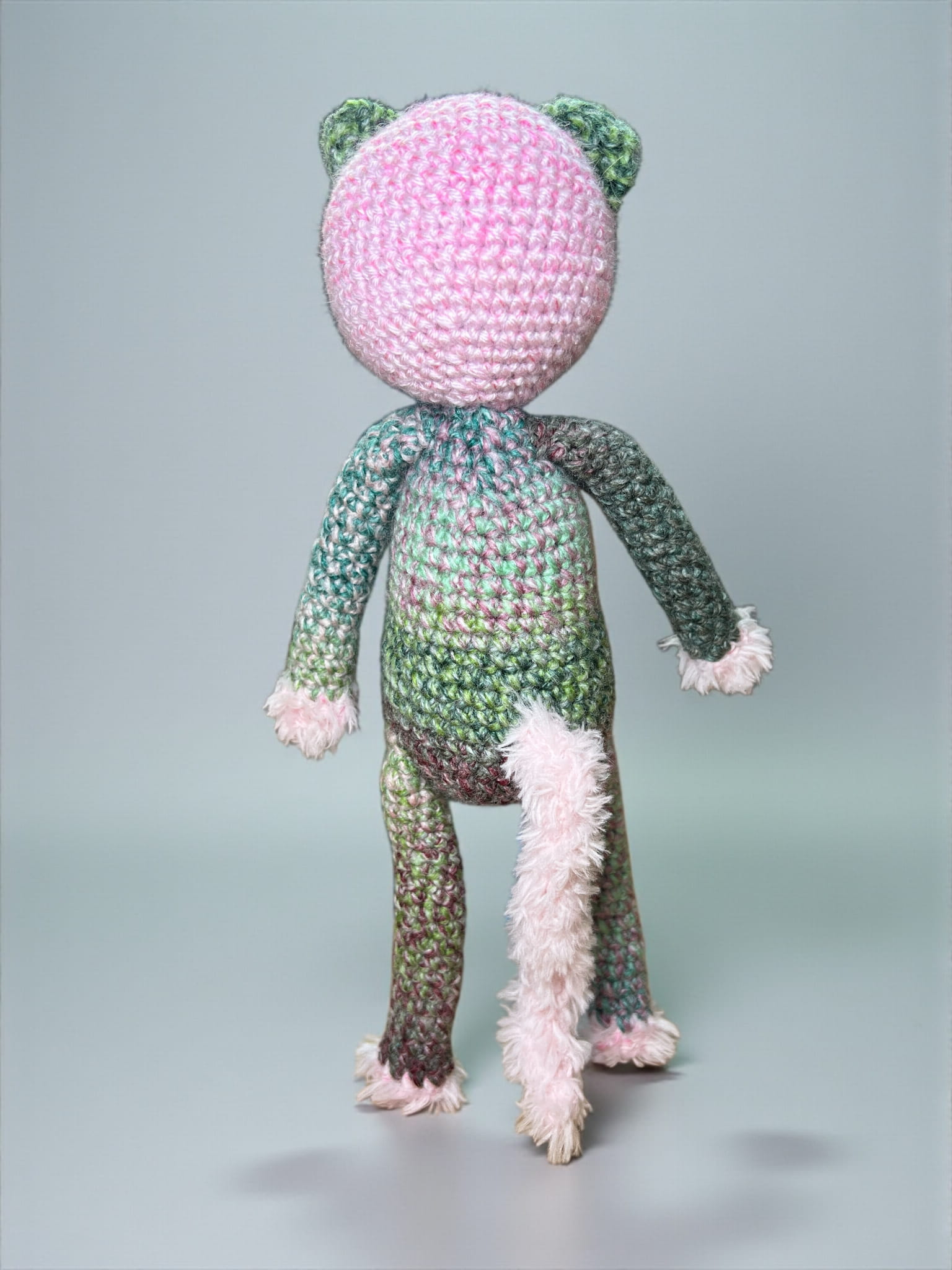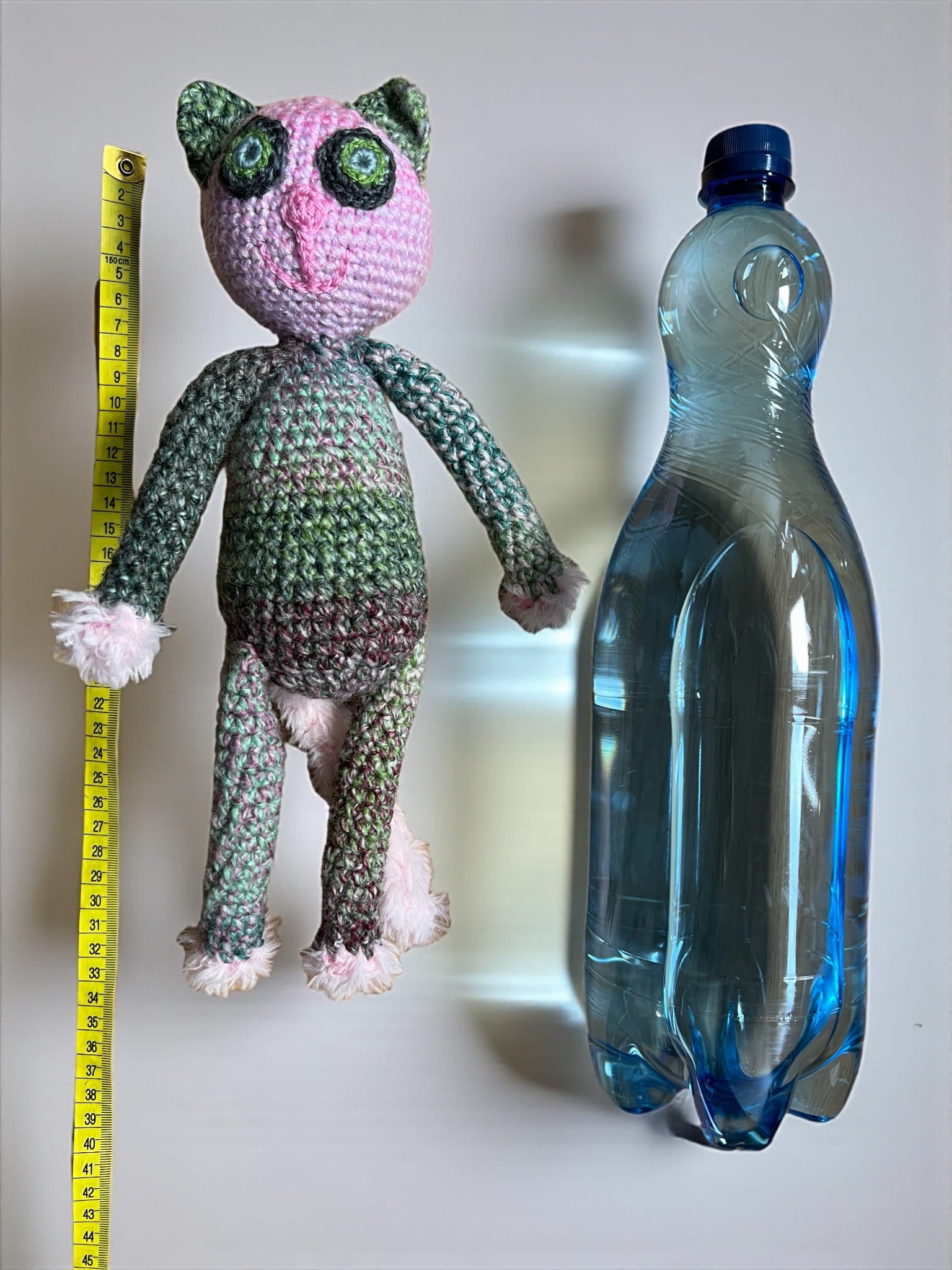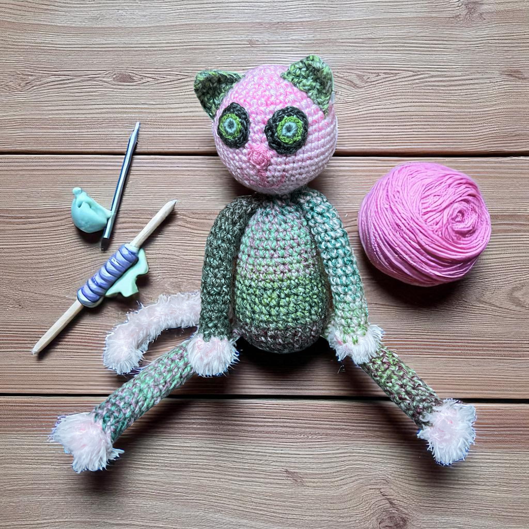 Jestem kolejnym unikatowym kotkiem w naszej kolekcji „Szydełkowe Rozrabiaki”, każdy z nas ma swoją historię i charakter – ja mam zielono-różowe futerko z puszystymi detalami, gotowy, żeby wnieść radość i energię do Twojego domu.
