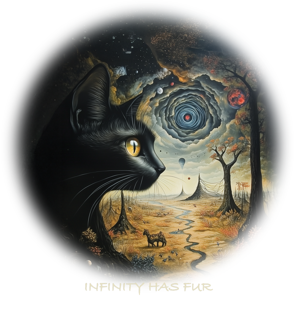 Na granicy snu i nieskończoności, tam, gdzie przestrzeń zakrzywia się w wir nieskończonych możliwości, pojawia się Ona – kotka, której spojrzenie prowadzi do innego wymiaru. To nie jest zwykłe zwierzę. To strażniczka kosmicznej tajemnicy, przewodniczka ścieżki wijącej się przez krajobraz wieczności.