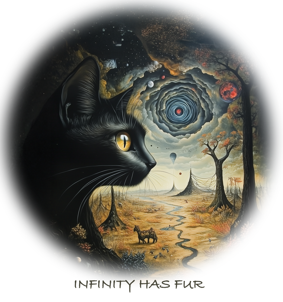 Na granicy snu i nieskończoności, tam, gdzie przestrzeń zakrzywia się w wir nieskończonych możliwości, pojawia się Ona – kotka, której spojrzenie prowadzi do innego wymiaru. To nie jest zwykłe zwierzę. To strażniczka kosmicznej tajemnicy, przewodniczka ścieżki wijącej się przez krajobraz wieczności.