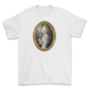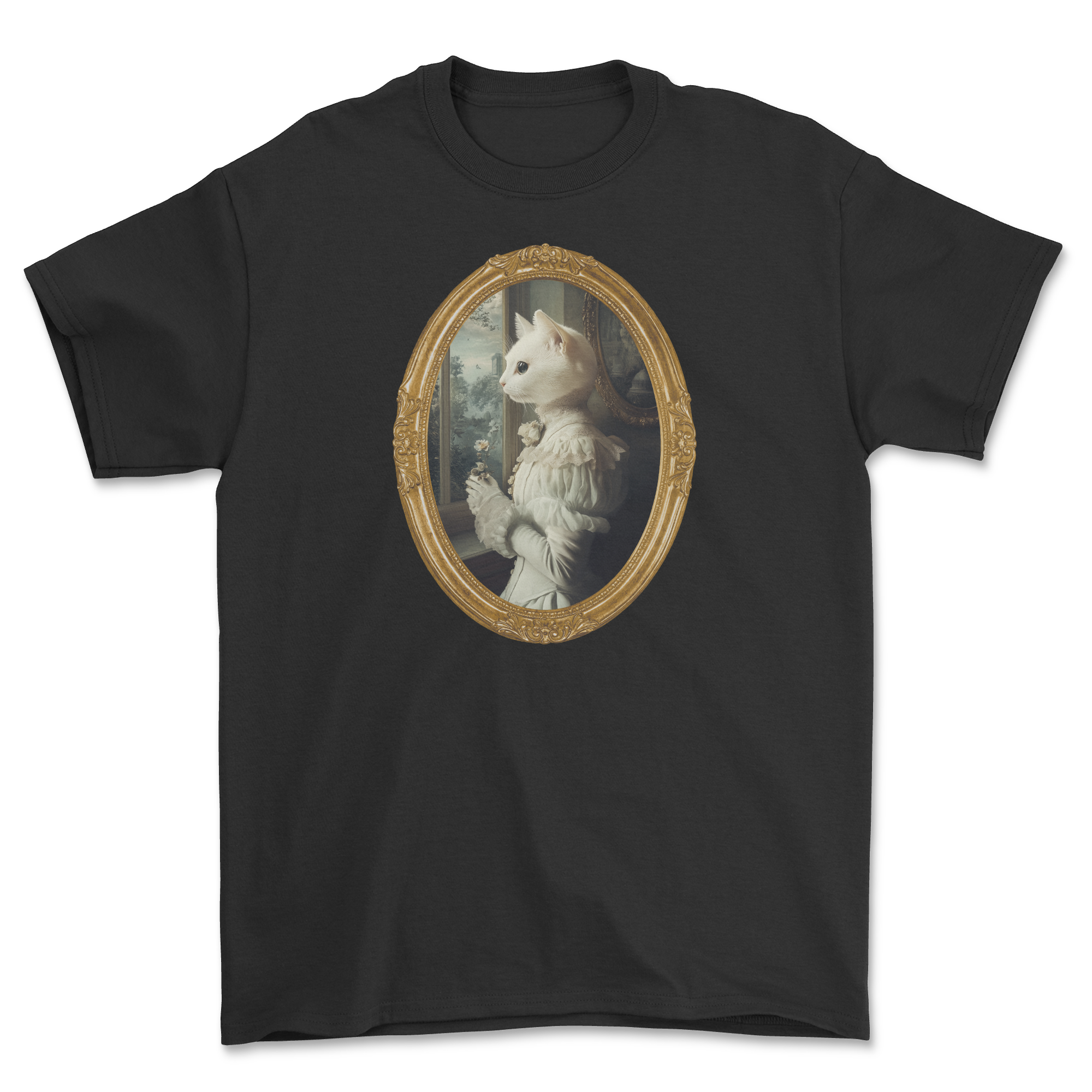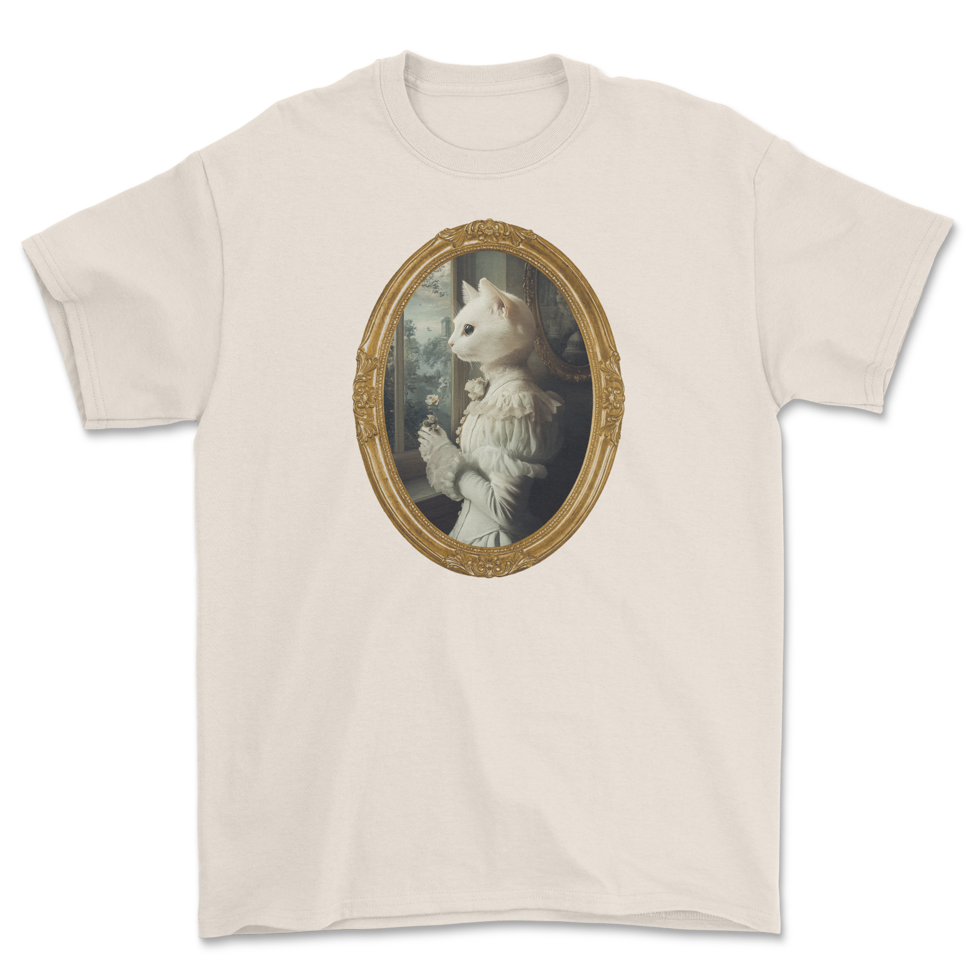 W jednym z eleganckich salonów, tuż przy oknie, kocia dama stoi w zadumie, delikatnie trzymając kwiat w dłoni. Jej biała sierść połyskuje niczym najczystszy jedwab, a suknia, pełna detali i elegancji, przyciąga wzrok każdej osoby, która ją ujrzy. Z jej twarzy bije spokój, ale i pewność siebie, jakby była częścią najwyższych sfer towarzyskich. Właśnie jak w Bridgertonach, gdzie każda debiutantka marzy o zrobieniu wrażenia na londyńskim społeczeństwie, tak i ta kocia dama przygotowuje się do najważniejszego balu sezonu. W tle widnieje majestatyczny krajobraz, jakby widoczny tylko przez okno największej rezydencji – zamek pełen tajemnic i wykwintnych zwyczajów. Ten portret, uchwycony w złotej ramie, to symbol nie tylko piękna, ale i niezłomnej klasy kociej arystokracji.