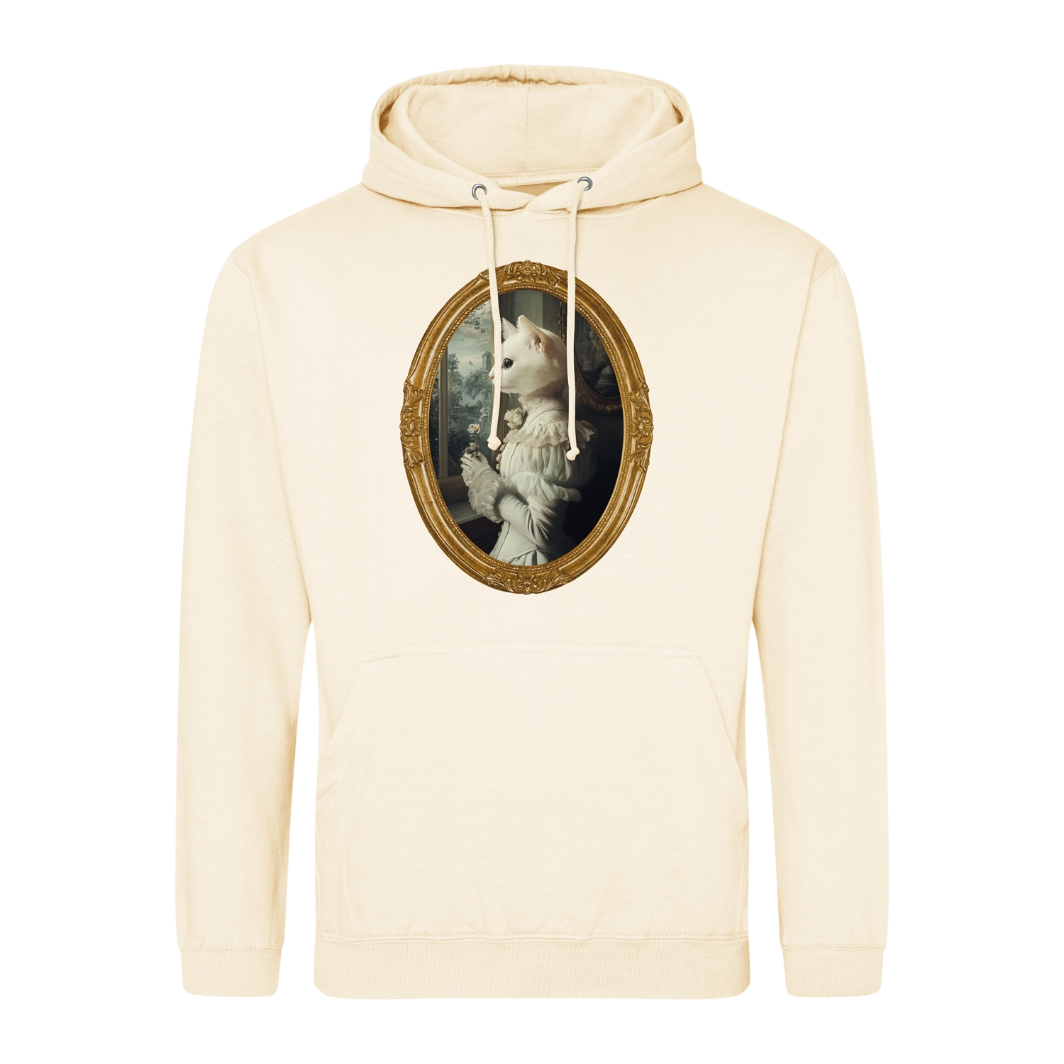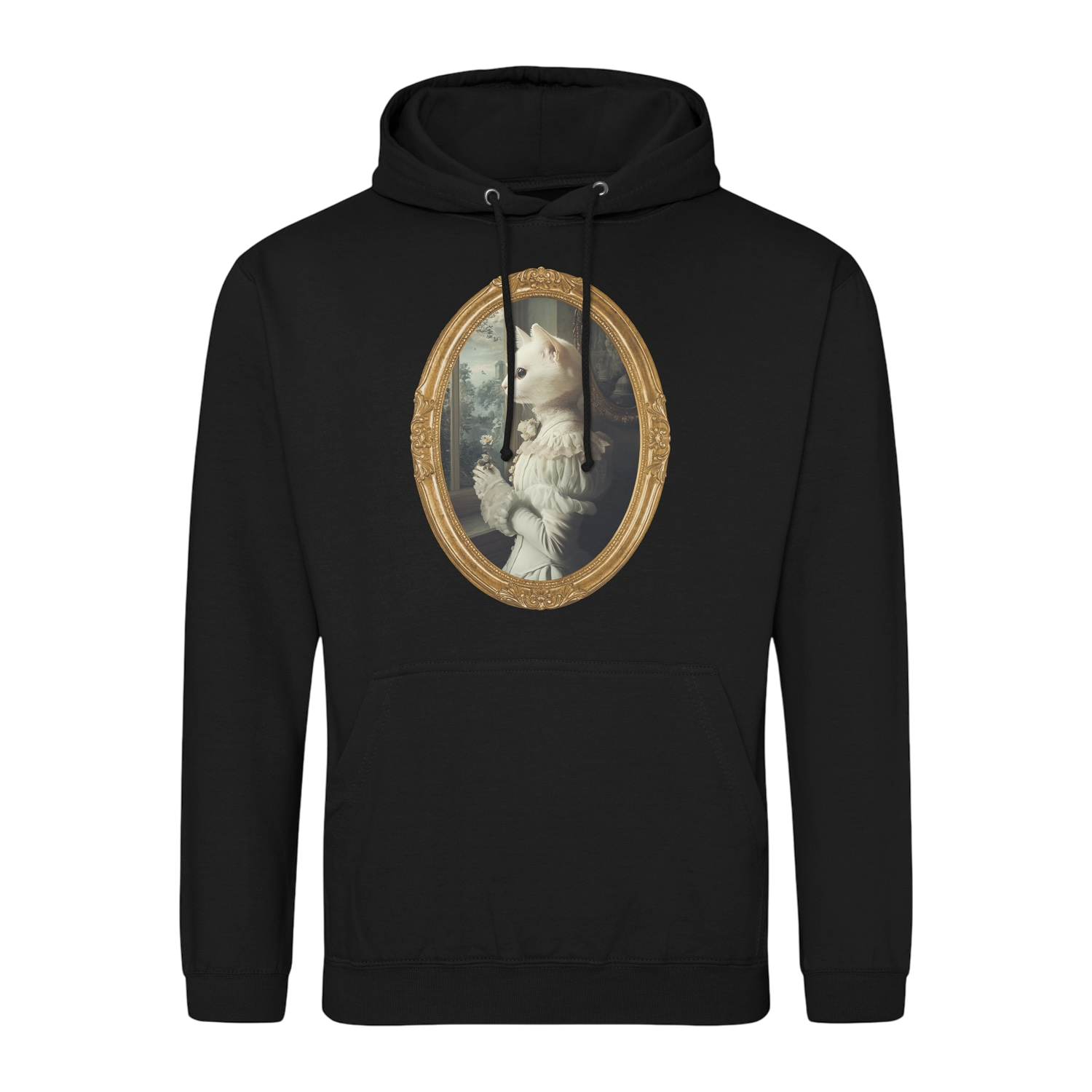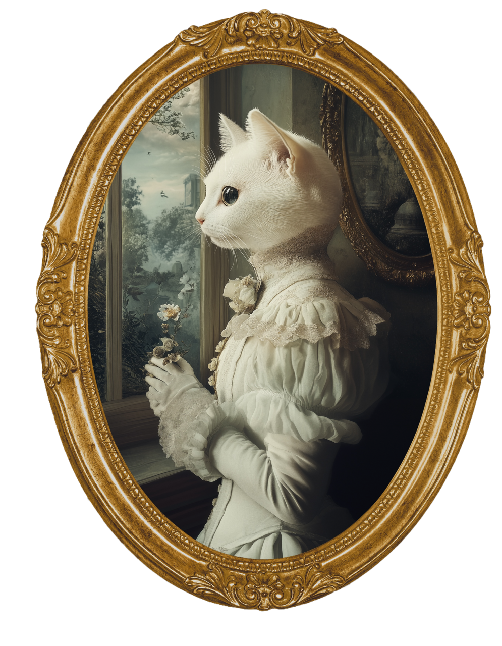 W jednym z eleganckich salonów, tuż przy oknie, kocia dama stoi w zadumie, delikatnie trzymając kwiat w dłoni. Jej biała sierść połyskuje niczym najczystszy jedwab, a suknia, pełna detali i elegancji, przyciąga wzrok każdej osoby, która ją ujrzy. Z jej twarzy bije spokój, ale i pewność siebie, jakby była częścią najwyższych sfer towarzyskich. Właśnie jak w Bridgertonach, gdzie każda debiutantka marzy o zrobieniu wrażenia na londyńskim społeczeństwie, tak i ta kocia dama przygotowuje się do najważniejszego balu sezonu. W tle widnieje majestatyczny krajobraz, jakby widoczny tylko przez okno największej rezydencji – zamek pełen tajemnic i wykwintnych zwyczajów.