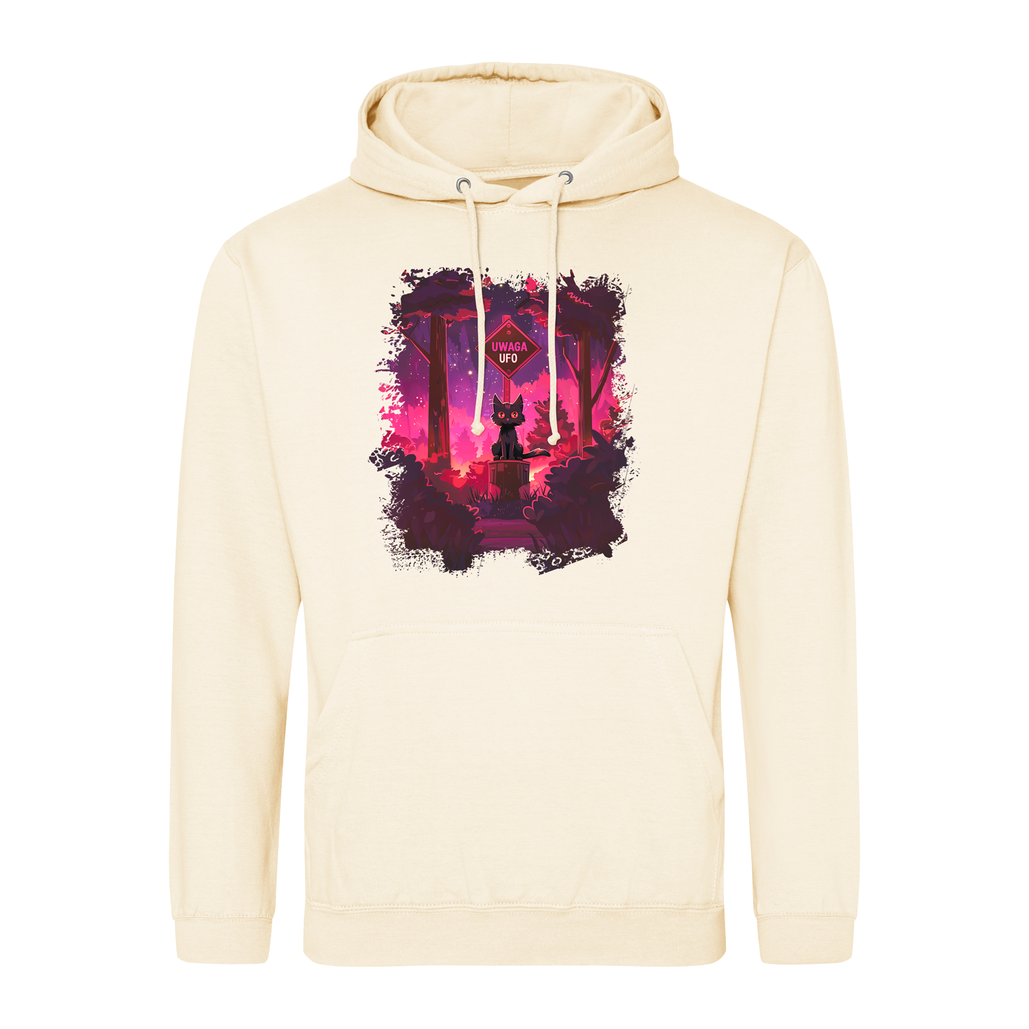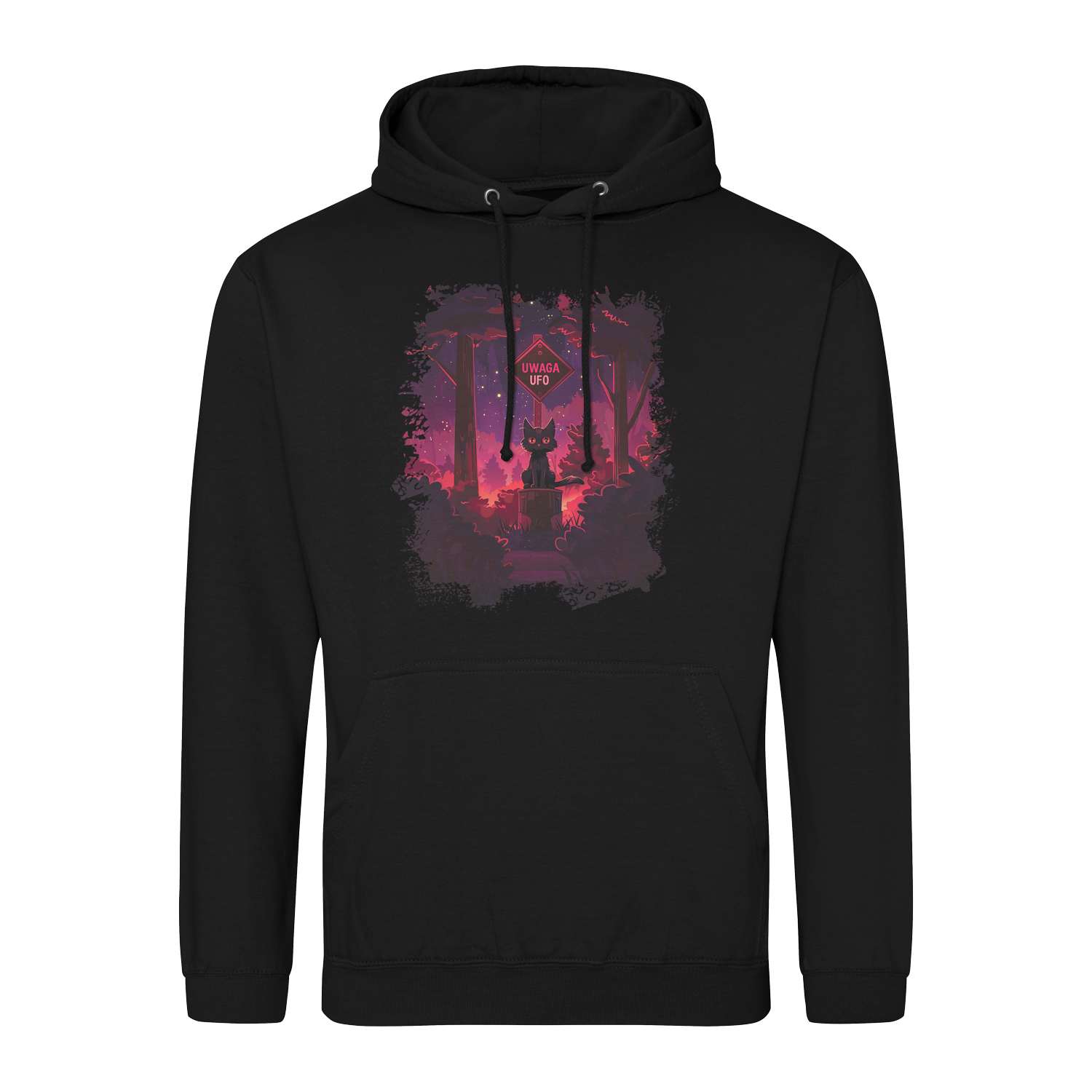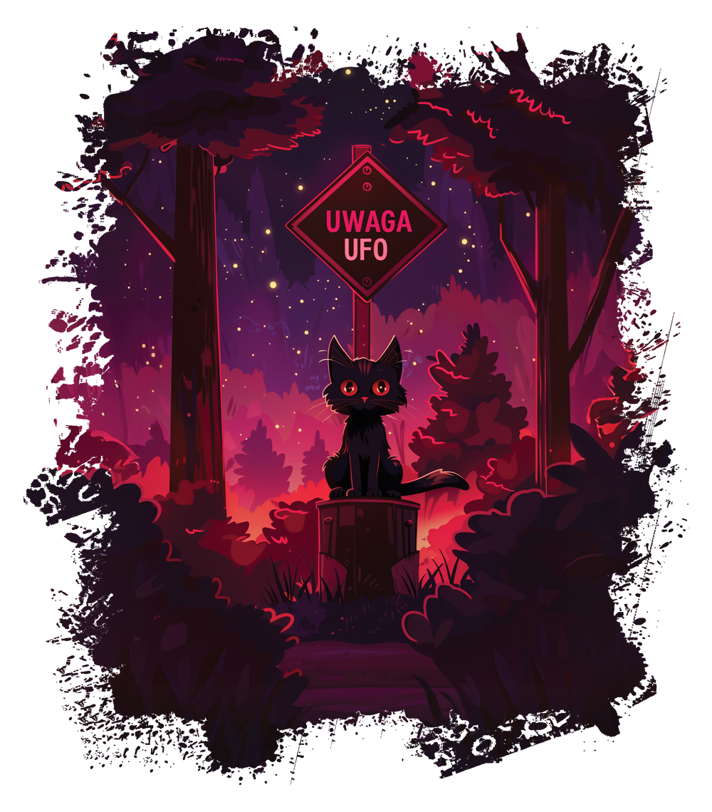 To zawsze zaczyna się od ciszy. Tego rodzaju ciszy, która zapada tuż przed czymś niezwykłym. W samym środku mrocznego lasu, na starej drewnianej beczce, siedzi on – czarny kot, patrzący w górę, jakby czekał na coś, co zaraz nadejdzie. Nad jego głową znak ostrzega: „Uwaga UFO”. Ale kto kogo powinien ostrzegać?