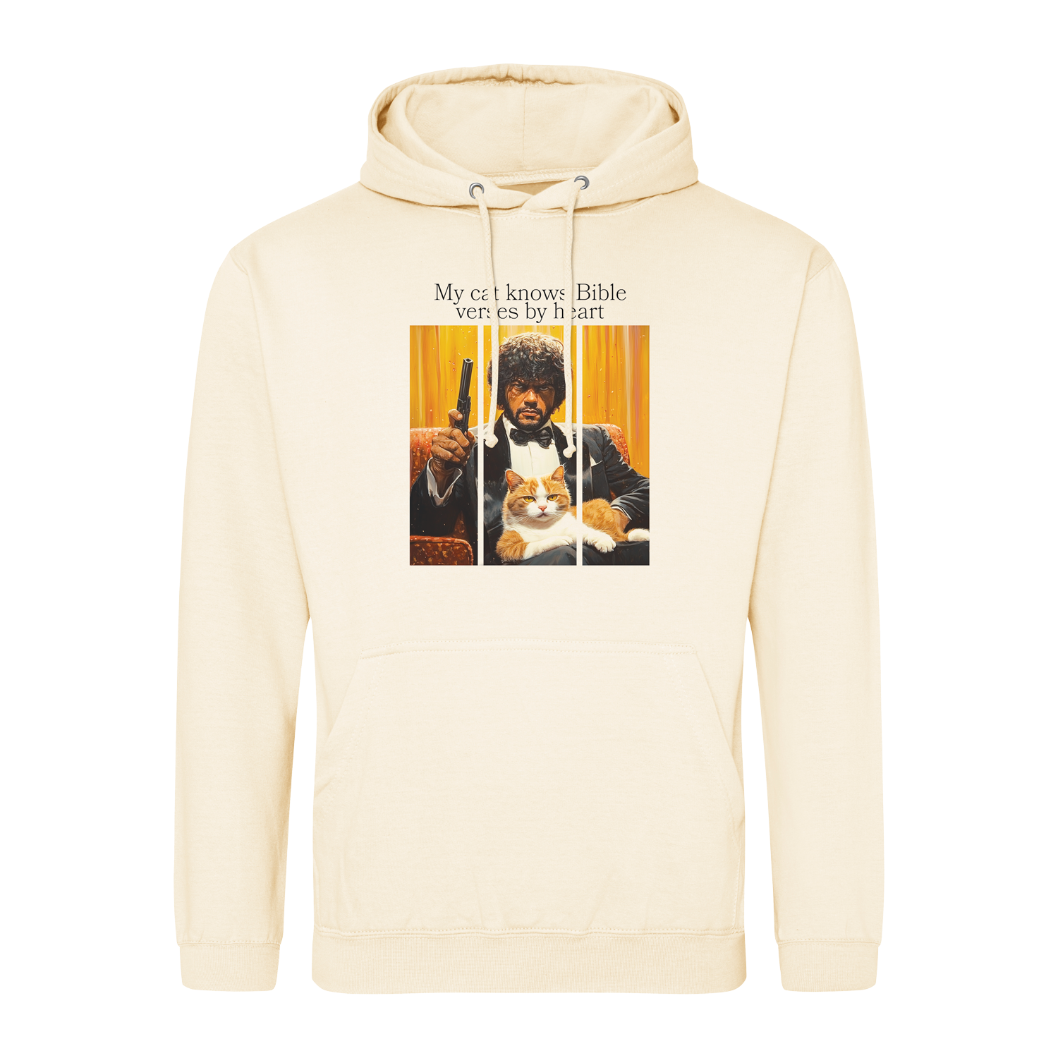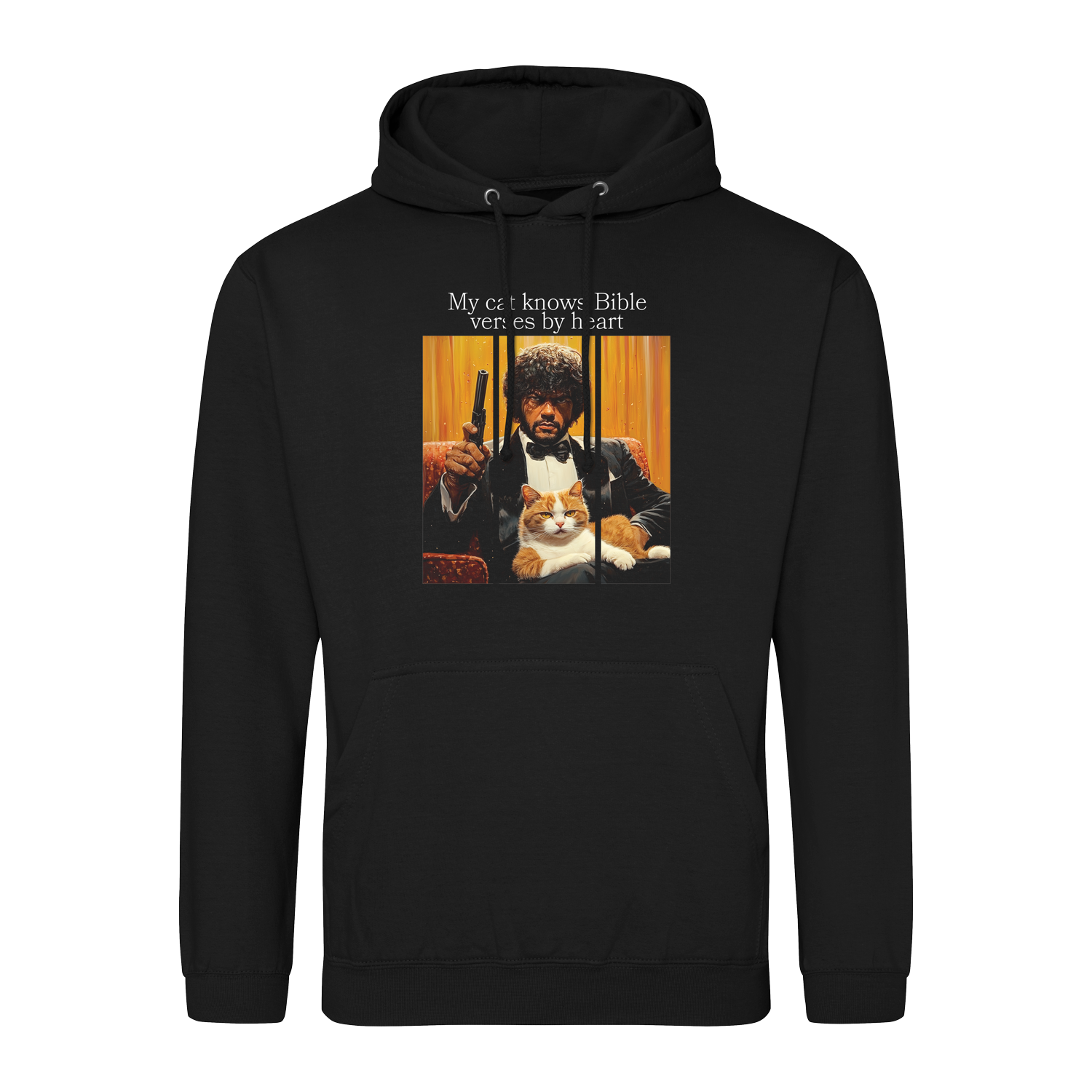 "My Cat Knows Bible Verses by Heart" to coś więcej niż ubranie – to hołd dla inteligencji, humoru i kociego majestatu. Idealna dla fanów Tarantino, miłośników kotów i tych, którzy wiedzą, że koci kompan to prawdziwy mentor.