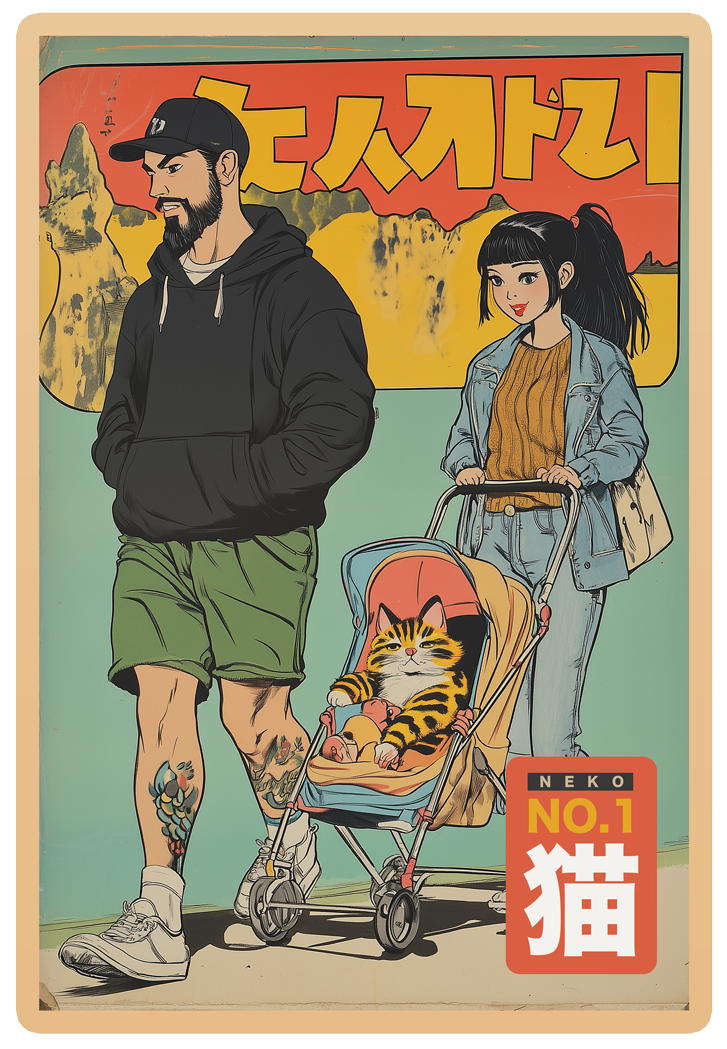 W sercu japońskiego miasta, gdzie tempo życia jest zawrotne, króluje on – Nekko Neko. Kot, który zamiast biegać po chodnikach, zasiada na tronie w postaci stylowego wózka, spoglądając z góry na swoich poddanych. W jego orszaku – młody tata z tatuażami i stylowa mama, zawsze gotowi spełnić każdą jego zachciankę.