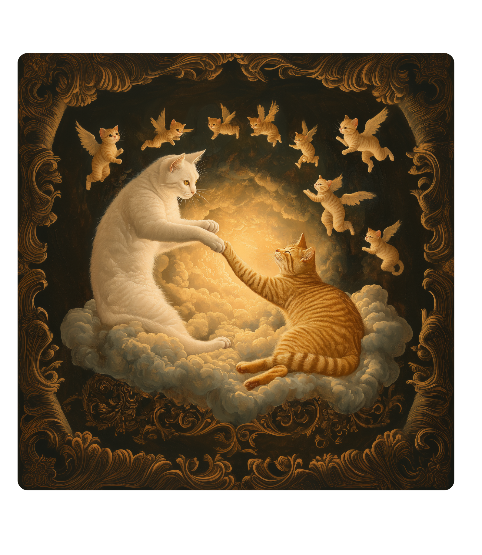To tam, pośród puszystych chmur i złocistego światła, wielki Stwórca Kota wyciągnął łapę, by dotknąć ziemskiego wybrańca – rudego włóczęgę, niezależnego wędrowca, który przeszedł przez wiele światów. W tej jednej chwili, w tym jednym dotyku, przekazał mu pradawną wiedzę – jak chodzić bezszelestnie, jak patrzeć z wyższością na śmiertelników, jak znajdować słońce nawet w najbardziej pochmurny dzień.