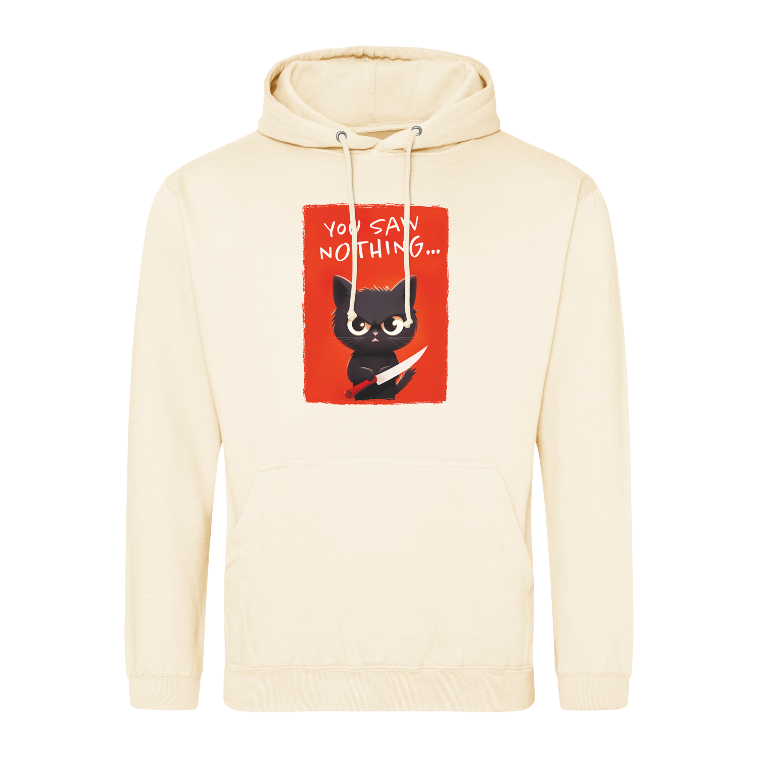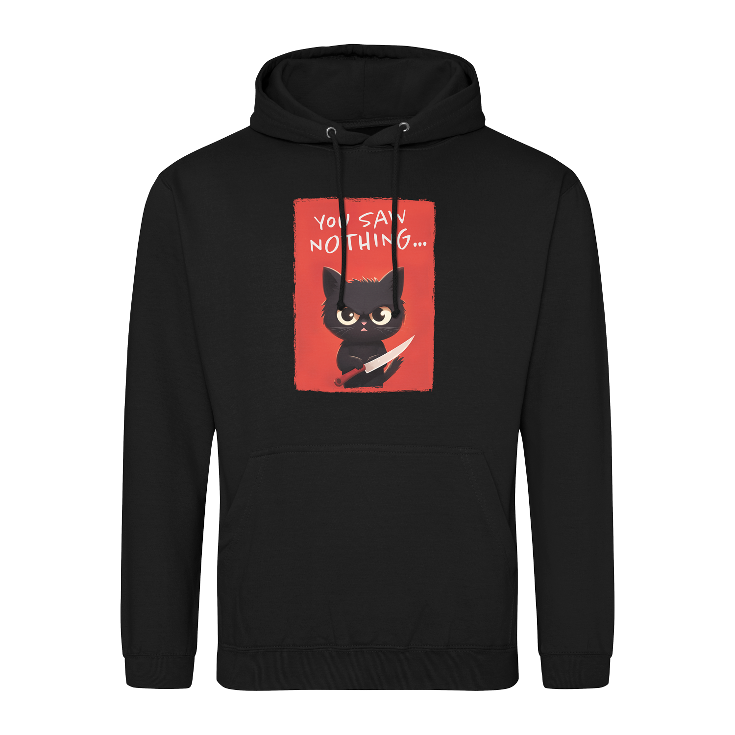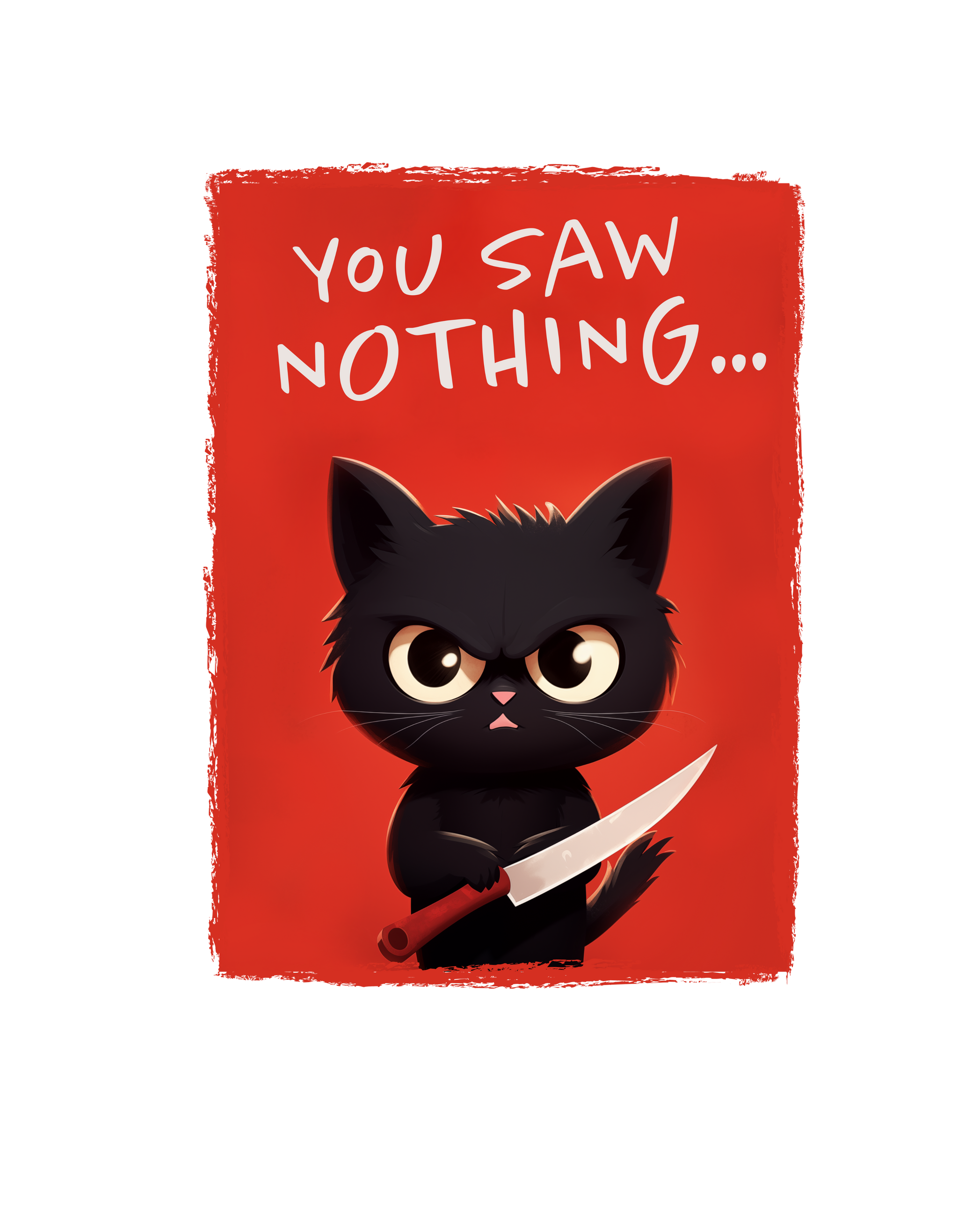 Cisza zapadła jak w kryminale tuż przed końcem pierwszego rozdziału. Ten kot patrzy prosto w twoje oczy, trzymając nóż tak pewnie, jakby był mistrzem kuchni... albo w czymś bardziej mrocznym. „You saw nothing...” – to nie ostrzeżenie, to obietnica, że żadnej tajemnicy nie wyjawisz, bo przecież on tu rządzi.